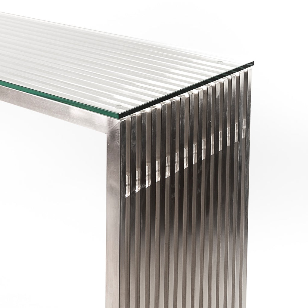 Complete your modern minimalistic living room with the Acco Console. Constructed out of brushed stainless-steel fused together in stream-lined rows, this piece is a nice accent to any chic decor. Each line in the table is parallel to the next, creating perfect symmetry and balance.